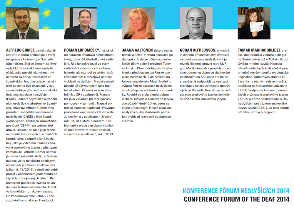 Photoalbum / Fotogalerie Fórum neslyšících 2014, Praha, Česká republika 13.-14.11.2014 Fórum 2014Popis projektu Partneři Programy Registrace a platby Ubytování Available is interpreting and translation transcript Plakát Místo semináře Kontakt Fotogalerie Osobnosti Fotogalerie