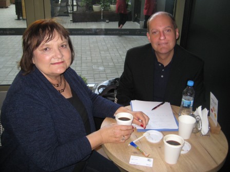 2. Foto: Na recepci hotelu, u stolu pan Lupoměský a (zleva) paní Rozcan, prezidentka Polského svazu neslyšících.