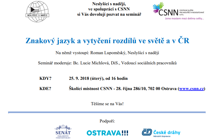 Přednáška pořádaná ve spolupráci s CSNN v úterý 25. září 2018 od 16:00 hod v sídle CSNN. Hostem bude Roman Lupoměský, zástupce organizace Neslyšící s nadějí, spolu s doprovodem. Moderuje paní Bc. Lucie Michlová, DiS.