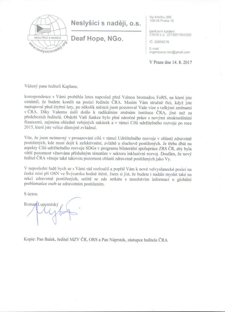 Víte, že jsem neúnavný v prosazování cílů v rámci Udržitelného rozvoje v oblasti zdravotně postižených, kde musí dojít k zefektivnění, zvláště u sluchově postižených. Je třeba dbát na aspekty Cílů udržitelného rozvoje SDGs v programu bilaterální spolupráce ZRS ČR, aby byla vetší pozornost věnována příslušným tématům v sektoru inkluzivní rozvoj. Doufám, že nový ředitel ČRA věnuje také takovou pozornost oblasti zdravotně postižených jako Vy.