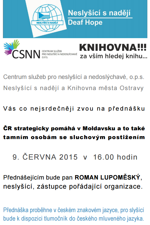 V úterý 9. června 2015 v 16.00 hodin se v knihovně města Ostravy pražském uskuteční přednáška na téma ČR strategicky pomáhá v Moldavsku a to také tamním osobám se sluchovým postižením. Přednáška pořádá Neslyšící s nadějí ve spolupráci s CSNN, o.p.s a také Knihovnou města Ostravy a vystoupí na něm Roman Lupoměský.