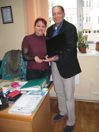 1. Foto: Vedoucí týmu tlumočnických služeb pro neslyšící v Kišiněvě převzala s úsměvem notebook.